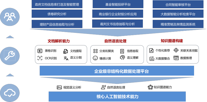 智能金年会的企业级非结构化处理平台主要处理的是文档、影像件等非结构化数据,通过视觉语义分析和自然语言处理,将结构化数据转化为非结构化数据,后续根据不同业务场景对结构化数据进行关联与分析,协助人们快速的阅读、理解和分析各类文档内容,降低企业、政府及各种组织中文档的重复阅读、整理和分析的工作,提升非结构化数据处理效率及数据的流动、共享和使用能力。产品已经实现了金融行业(银行、证券、保险)、烟草、政务、财政税务等行业领域的场景落地,完成了良好的工程实现,并积累了大量的金融、政务和烟草行业市场化训练数据,形成了技术壁垒,可以在这些行业进行良好的拓展。